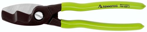 Efficient one-hand cable cutter for clean cuts on aluminum and copper cables (up to 20 mm diameter). Dual blades allow smooth initial and final cuts without crushing or deformation. Not suitable for steel or hard-drawn copper cables.